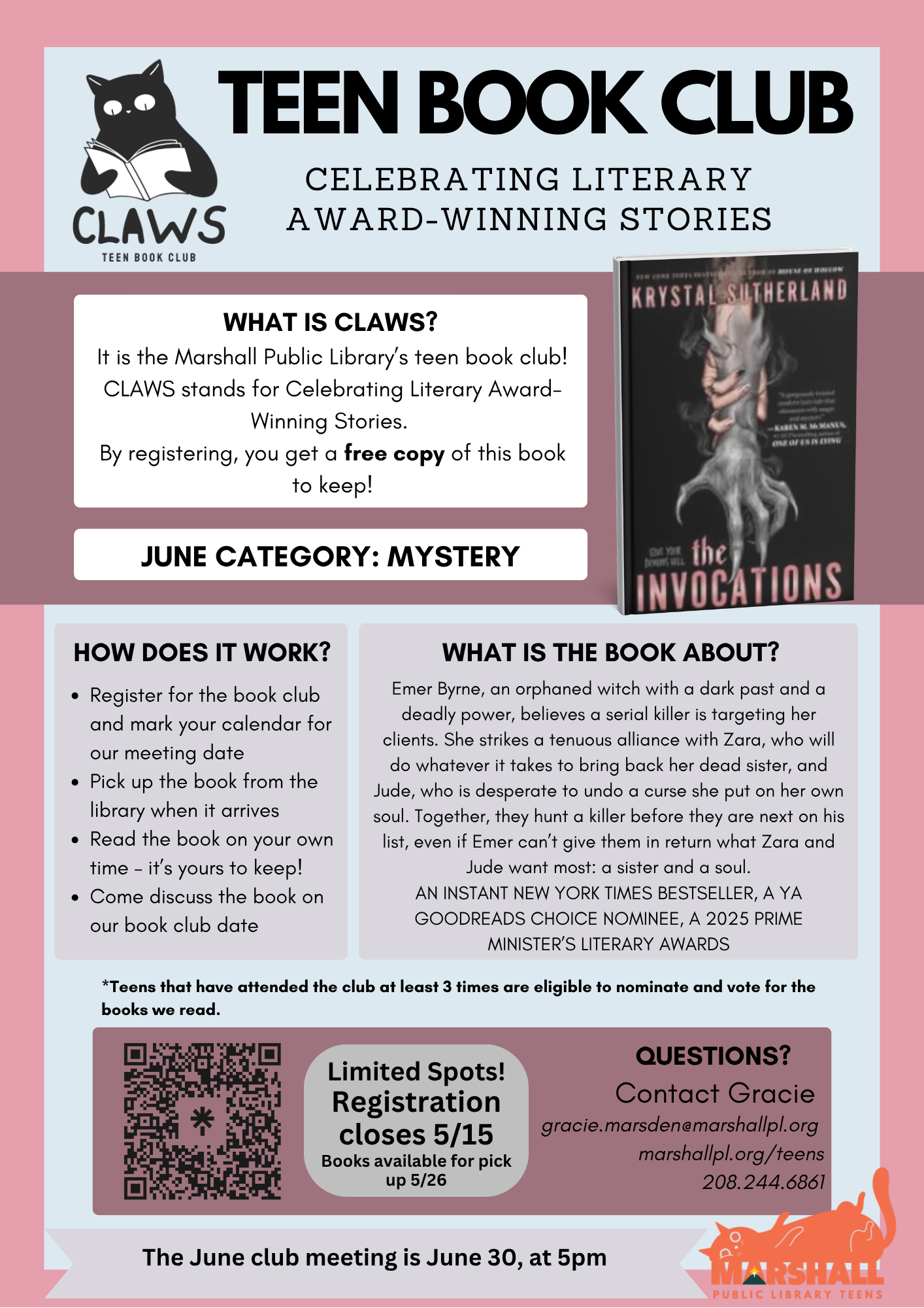 | CLAWS (Celebrating Literary Award-Winning Stories) teen book club | Monthly 5/26 7-8pm 6/30 5/6pm | Thanks to the generous sponsorship from the Friends of the Marshall Public Library, we now have funds to host our monthly teen book club! Every month, teens vote to read an award-winning YA novel published within the last 4 years. Registrants receive a free copy of the book to read. We then meet at the end of the month to discuss the book! | Register for CLAWS | ![]() |