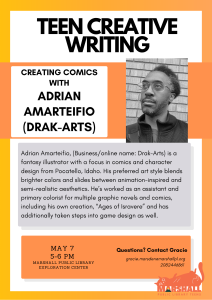 | Teen Creative Writing | Weekly (every Thursday) 5-6 (Workshop) and 6-7 (Lab) | Join other teen writers in your area and build your writing community! The first meeting of every month will feature a guest presenter to teach about a specific aspect of writing. All other meetings are for you to share your work and get feedback from your peers!Please email workshop pieces to gracie.marsden@marshallpl.org. | No registration required | ![]() |